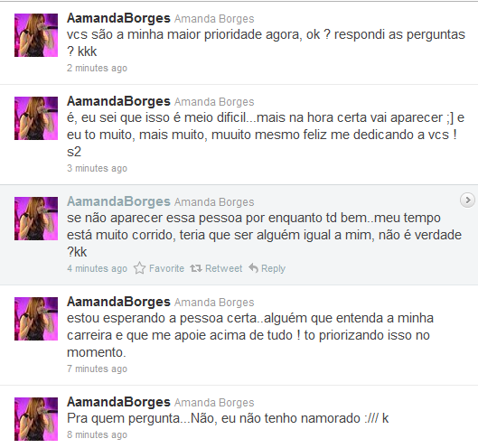 A Cantora postou em seu twitter o motivo por não estar namorando, Muito trabalho e ela mesmo falou que a carreira está em primeiro lugar, nois fãs agredecemos haha :) veja